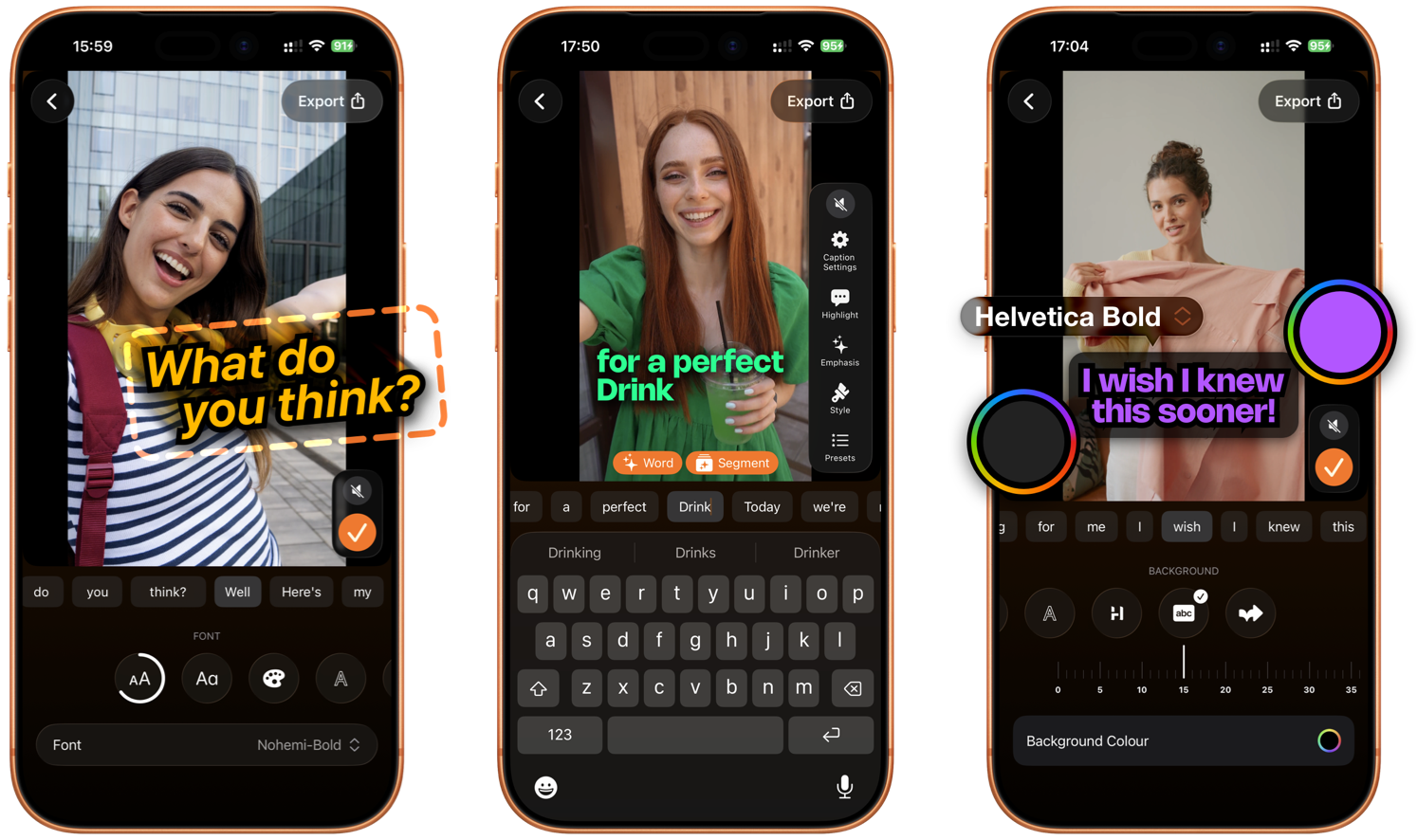 With Captions, your video doesn’t need to be uploaded or posted to a social pltform just to add subtitles. Everything happens on your device. You import your video, generate captions, customise the look, and export a finished file — ready to share anywhere.