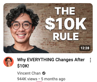 Vincent purposefully makes the title and thumbnail vague and dramatic to spark interest, which will maximise the video’s click-through rate. More people are probably inclined to click on that title and thumbnail than if it were something more specific like ‘Why saving money gets easier after your first £10k’.