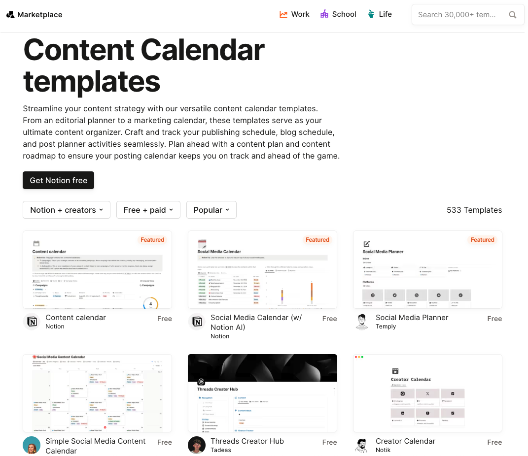 Once you have your list of subtopics, you can organise your ideas into your content calendar of choice. Notion has some great free content calendar templates that are free to download and easy to use. Many are platform-specific, and some even have extra functionality like goal-setting or performance metrics built in. We suggest browsing their content calendar template library to see which one best meets your needs.